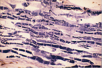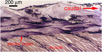 The electric fish that we study in our lab, South American ghost knifefish (family Apteronotidae), are exceptional in that their electric organs are derived from nervous tissue, rather than muscle. The electric organ of apteronotid fish consists of bundles of hypertrophied axons of spinal electromotor neurons. These axons synchronously and rhythmically produce action potentials to generate a high-frequency, oscillating (AC) electrical field around the fish.