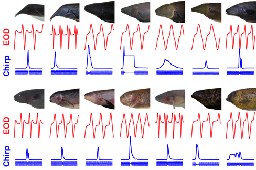 Evolution of EODs and Chirps. Our laboratory studies two different types of communication signals in electric fish: the electric organ discharge (EOD), and modulations of the EOD known as chirps (click here for background information on chirping). We study EODs and chirping in different species of ghost knifefishes (Apteronotidae), the largest family of South American electric fishes. EOD frequency ranges from ~500 Hz to 2000 Hz in these fish (click here for background information on species differences in EOD frequency). The waveform of the EOD (how the voltage changes during a single discharge) also varies across species. Species differences in EOD frequency and waveform may allow fish to use the EOD to identify the species of other fish.