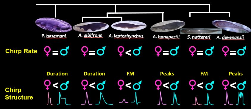 Evolution of Sex Differences in Chirping. Sex differences in chirping also vary across species. In A. leptorhynchus, chirping is highly sexually dimorphic. Males chirp much more than females and produce high-frequency chirps that females rarely produce. Chirping is also sexually dimorphic in other species that we have studied, but sex differences in the chirps of these species are more subtle. Unlike in A. leptorhynchus, the number of chirps produced in response to playbacks in these species does not differ significantly between sexes. Instead, males and females differ mainly in chirp structure. Male Sternarchogiton nattereri produce chirps with more frequency modulation than those of females (Ho et al. 2013). Chirps of male A. albifrons and Parapterontus hasemani are longer in duration than those of females (Kolodziejski et al. 2005; Petzold and Smith 2016). In A. devenanzii and A. bonapartii, males are more likely than females to produce “multi-peaked chirps” (Zhou and Smith 2006; Ho et al. 2010). A current focus of our research is to characterize sex differences in EOD frequency and chirping across many different apteronotid species to understand how sex differences in electrocommunication behavior evolved.