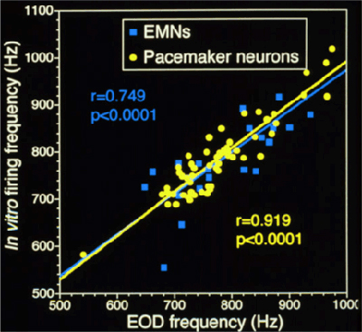 The Electromotor System is a Model for Motor Pattern Generation. The electric organ discharge (EOD) and the regular firing of the neurons that control it are among the fastest and most precise biological oscillations. In apteronotid electric fish, EOD frequency can approach 2000 Hz. The firing rates of pacemaker neurons and electromotor neurons correspond directly to EOD frequency. These neurons thus produce action potentials synchronously at rates of up to 2000 times per second, which makes them the most rapidly firing neurons in any animal. One of the goals of our research is to understand the cellular mechanisms that underlie these rapid and precise motor patterns and to understand how variation in neuronal properties among individuals and between sexes and species is related to behavioral diversity.