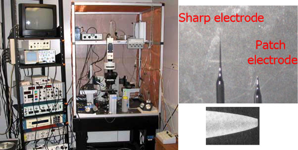 Voltage-clamp Experiments to Characterize the Biophysical Properties of Ionic Currents in Pacemaker and Electromotor Neurons: We use a microscope with Nomarski optics and an infrared-sensitive video camera to visually guide fire-polished glass micropipettes onto the membranes of pacemaker or electromotor neurons. We can then use voltage-clamp recordings to measure biophysical properties of the ionic currents that contribute to the spontaneous, high-frequency firing of these neurons. These studies allow us to examine the mechanisms of sex and individual differences in behavior from the level of single cells to entire organisms, and to study how these mechanisms evolve to produce different behaviors across species.