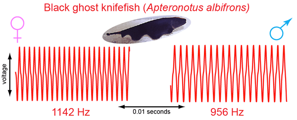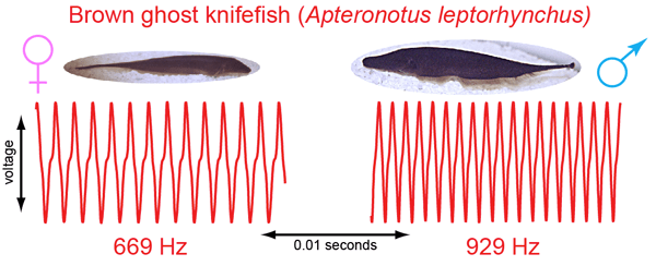 In the brown ghost knifefish (Apteronotus leptorhynchus), males discharge their electric organs at higher rates than females. Adult male A. leptorhynchus EODs are typically emitted at frequencies of 800-1050 Hz, whereas females typically have EOD frequencies of 600-750 Hz.